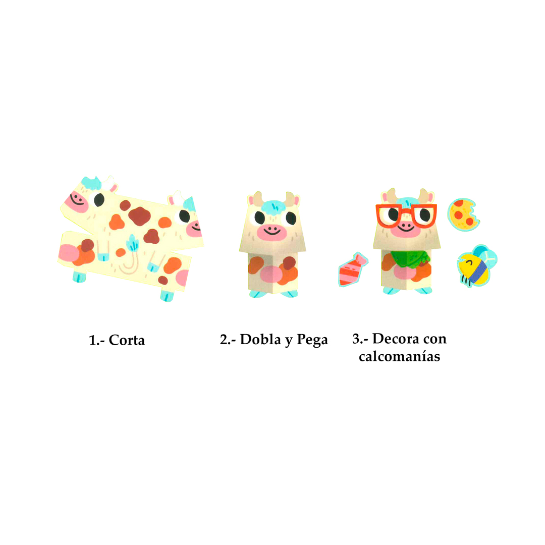 Con tu libro con calcomanías podrás doblar, armar y pegar a los animales de papel de la granja.