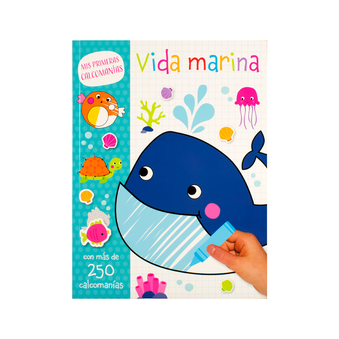 Diviértete pegando calcomanías y coloreando los dibujos en este libro con actividades llamado “Mis primeras calcomanías” sobre la vida marina