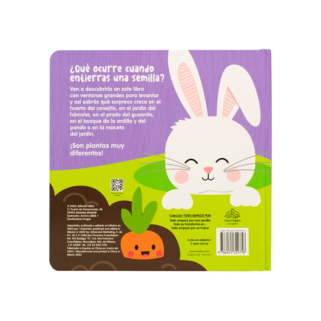 Todo empezó por una semilla” es un libro interactivo que invita a los niños a explorar el maravilloso mundo de las plantas y la naturaleza. Con ventanas grandes para levantar, los pequeños podrán descubrir qué ocurre cuando entierras una semilla y cómo ésta se convierte en una hermosa planta. Desde el huerto del conejito hasta el jardín del hámster, pasando por el prado del gusanito, el bosque de la ardilla y del panda o la maceta del jardín, cada página presenta una sorpresa única.